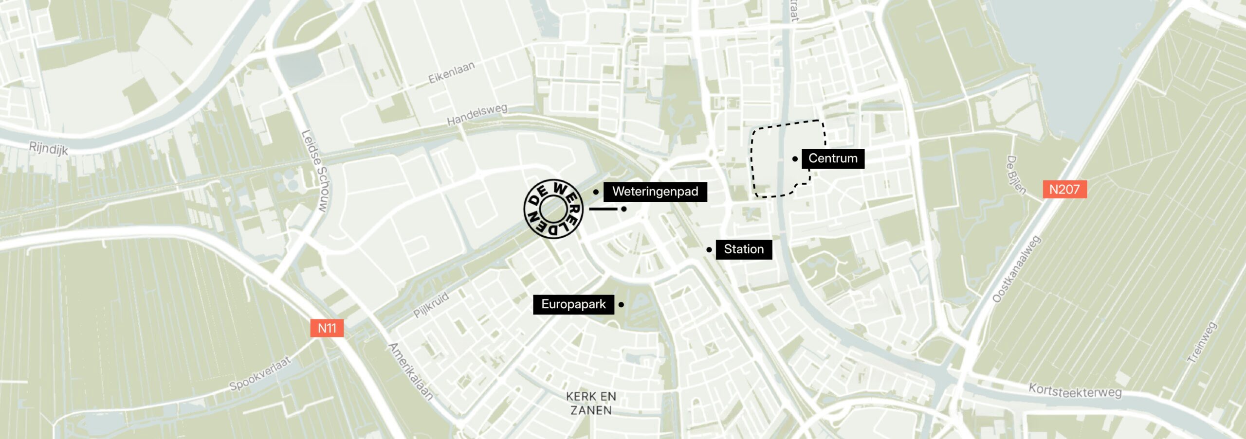 De wijk ligt aan de rand van het centrum van Alphen aan den Rijn, op loopafstand van winkels, horeca en het station. Tegelijkertijd woon je met zicht op de groene oevers van de Molenwetering. Hier woon je in balans: stedelijke energie om de hoek, rust en ruimte om je heen.
